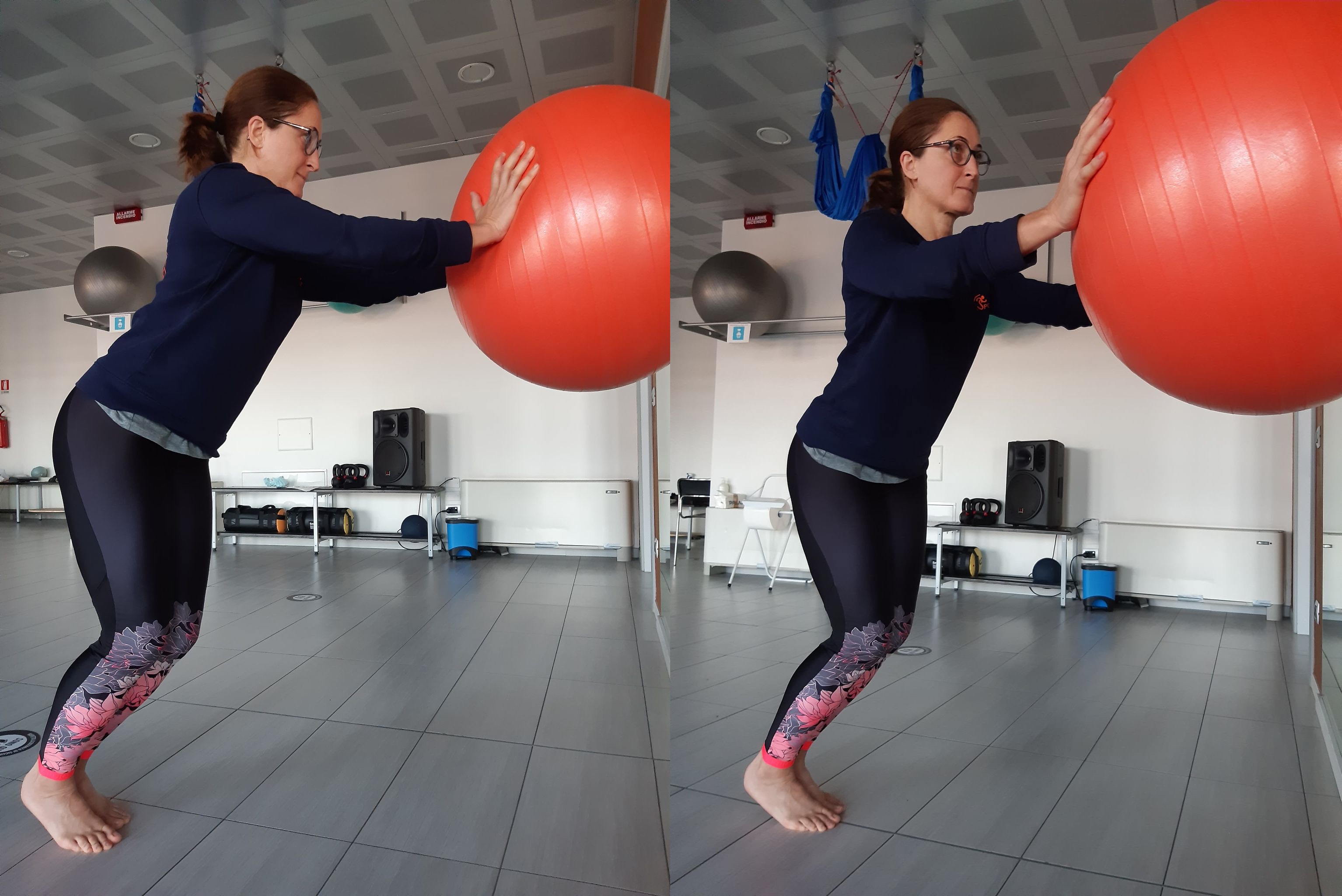 Affondi in avanti con fitball alla parete: esercizio che allena stabilità e forza.Dopo aver sistemato la palla nella parete di fronte a te all’altezza del petto, appoggiati con le mani e le braccia ben distese. I piedi sono circa ampiezza del bacino fra di loro, la distanza dalla parete deve essere tale da consentire un’attivazione addominale, i talloni rimangono sollevati dal pavimento. Da piedi vicini, con il piede destro effettua in passo in avanti verso la parete ma divaricando, come se volessi disegnare una linea diagonale al suolo. La gamba sinistra si distende del tutto, la destra si piega. Dopo aver effettuato 8 di questi movimenti lenti e controllati con la gamba destra, passa all’altra gamba.- Saltelli laterali con fitball alla parete: esercizio che allena stabilità, forza e potenza.